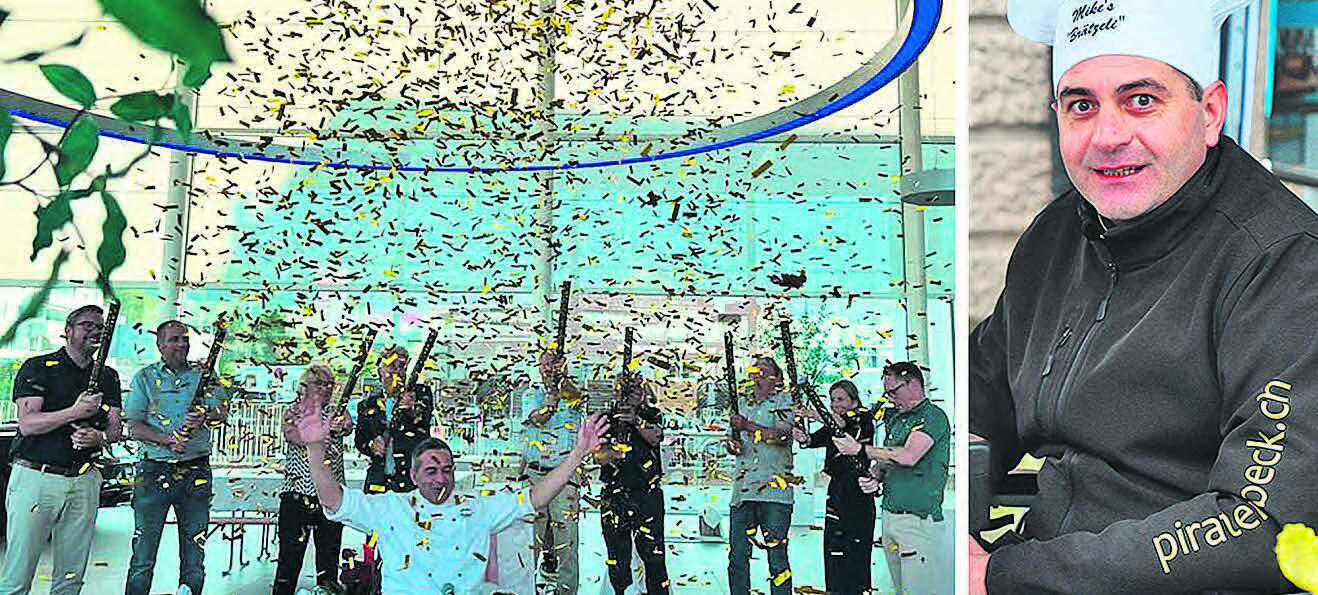 − rc. In der Wyna-Garage in Reinach wurde am Dienstag bis gegen Mitternacht gefeiert. Anlass dafür war das zehntausendste Säckli «Mikes Brätzeli», das Mike Hunziker verkauft hat. Bei 5 Franken, die pro Säckli an die MS-Stiftung gehen, ist in den letzten dreieinhalb Jahren ein namhafter Betrag zusammen gekommen. Das 10’000ste Säckli wurde nun speziell gefeiert und dieses wechselte für satte 10’000 Franken die Besitzer. Hinter der Aktion stand jedoch nicht eine Versteigerung, wie man sie auch schon bei anderen «runden» Zahlen erlebt hat – diesmal taten sich zehn Sponsoren zusammen und unterstützen die Bemühungen von Mike mit diesem wunderbaren Betrag. Einen Teil davon darf der selber an MS erkrankte Mike Hunziker für die Realisierung eines persönlichen Traums verwenden, das wurde so…