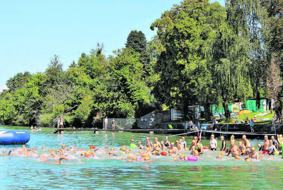 grh. Gefühlte 30 Grad an Land und 22 im Wasser. Besser hätten die Bedingungen beim 53. Hallwilerseeschwimmen am Samstag nicht sein können. Die Mitglieder der SLRG Hallwilersee strahlten mit der Sonne um die Wette. Emsig registrierten sie die über 300 Teilnehmenden vor dem Start, machten sich in Booten oder auf SUPs an die Sicherung der gut zwei Kilometer langen Strecke. Kurz vor 12 Uhr war es soweit: Das Startsignal ertönte, die Schwimmerinnen und Schwimmer stürzten sich in die Fluten. Bald schon wurden die Armschläge auf dem Wasser leiser. Es tanzten die orangen Badekappen auf den Wellen und keine halbe Stunde später erreichten die ersten das Ziel im Strandbad Beinwil am See – so sieht eine Eroberung aus. (Bild: grh)