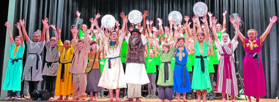 (Eing.) In den Herbstferien fand das Adonia-Musical «Josef – De Friedensstifter» in der Mehrzweckhalle Leutwil statt. 71 Kinder führten die biblische Geschichte von Josef auf, der sich nach langjährigem Streit mit seinen Brüdern versöhnte. 250 Besucherinnen und Besucher aus nah und fern genossen die spannende Darbietung aus Chorgesang, Theater, Videoclips und Pantomime. Als Überraschung hielten in der Schlussszene vier Kinder riesige Fünfliberstücke in die Höhe und sangen dazu «Dominus providebit» (Gott wird vorsorgen). Die acht Leiter sowie die Hauptleiterin Maja Hunn zeigten sich hochzufrieden über den Einsatz der mitsingenden Kinder und die Unterstützung der Erwachsenen und freuen sich bereits auf die Aufführungen im nächsten Jahr. (Bild: zVg.)