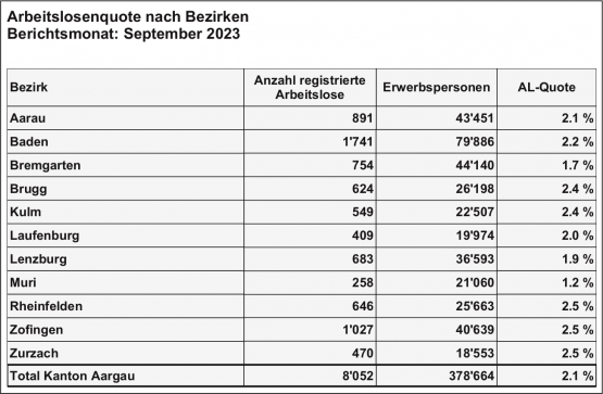Die Zahl der Arbeitslosen hat im September leicht abgenommen. Bei den sieben Aargauer RAV waren per Ende September 75 Personen weniger als arbeitslos gemeldet als im Vormonat. Die Arbeitslosenquote stagniert bei 2,1 Prozent.