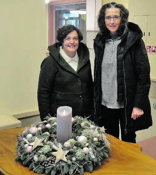 (Eing.) Ein zauberhafter Adventskranz erstrahlt am Eingang des Altersheims Dankensberg in Beinwil am See und erweckt leuchtende Augen bei Bewohnern und Besuchern. Dieses wunderschöne Geschenk wurde von zwei Frauen der Brockenstube Chrosihus überreicht. Mit grosser Freude und Dankbarkeit nahm das Altersheim dieses grosszügige Präsent entgegen. Das kunstvoll arrangierte Gesteck sorgt für weihnächtliche Stimmung. Die Verbundenheit mit dem Team der Brockenstube wird seit Jahren gepflegt und von der Stiftung Dankensberg sehr geschätzt. Auf dem Bild: Michelle Hintermann (links) und Marianne Käser.