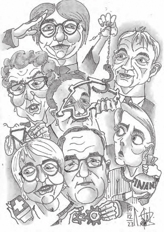 rc. Das offizielle Bundesrats-Gruppenbild wurde auch in diesem Jahr vom Menziker Karikaturisten Kari Stutz erschaffen. Es zeigt die sieben Mitglieder, die jeweils eine für ihr Departement typische Handbewegung machen – wie damals bei «Was bin ich» mit Robert Lembke. Das Rateteam hätte leichtes Spiel gehabt: Karin Keller-Sutter ist klar als Finanzbewahrerin zu erkennen und Elisabeth Baume-Schneider flüchtet ins Sportbusiness. Das Fahrrad enthüllt, dass es sich beim Umwelt- und Velominister um Albert Rösti handelt, während die Handschellen nicht eindeutig darstellen, wen Beat Jans als höchster Polizist des Landes gerade verhaftet. Während Guy Parmelin weiterhin Forschungen über die Funktionsweise von Zahnrädern anstellt, hat Ignazio Cassis die auswärtigen Angelegenheiten bestens im Griff,…