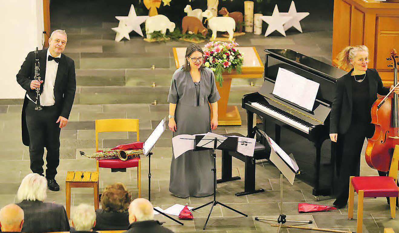 hh. Ein schmissiger, jazziger Auftakt mit «Ich brauche keine Millionen, mir fehlt kein Pfennig zum Glück…» sollte sicher nicht auf die Kollekte am Konzertende hinweisen. Sabine Bachmann-Frey am Klavier und Akkordeon, Sven Bachmann Klarinette und Saxophon und Martina Brodbeck am Cello sind alles Vollblutmusiker und begeisterten das Publikum mit auserlesenen Salonstücken. Zusammen spielen die Bachmanns schon seit 20 Jahren, und vor 14 Jahren ist Martina Brodbeck aus Basel dazugestossen. Mit einem Lächeln und mit Kopfnicken beginnen die Stücke und jedes Mitglied des Ensembles bringt seine Topleistung. Sven Bachmann übernahm…