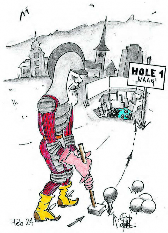 rc. Gerüchte über die kurz vor Abschluss stehenden Verhandlungen bezüglich Übernahme des Waag-Areals durch die Gemeinde Menziken gibt es zwar, doch eine Zwischennutzung scheint noch immer wahrscheinlicher: Der umtriebige Menzo soll eine Lösung gefunden haben, wie man das «Big hole» inmitten von Menziken rückbauen könnte, will unser Karikaturist Kari Stutz in Erfahrung gebracht haben. Er, Menzo, schlage vor, dort gratis einfache «Golfschläger» bereitzulegen. Die Menziker Schülerschaft würde im Handarbeitsunterricht aus guter, nicht kontaminierter Aushuberde handgeformte Bälle produzieren. Jeder Vorbeigehende könnte dann mit einem gezielten Schuss seinen Frust loswerden und so wenigstens auf diese Weise etwas dazu beitragen, damit der «Waag-Brache» wieder schönere Zeiten blühen. Ganz nach…