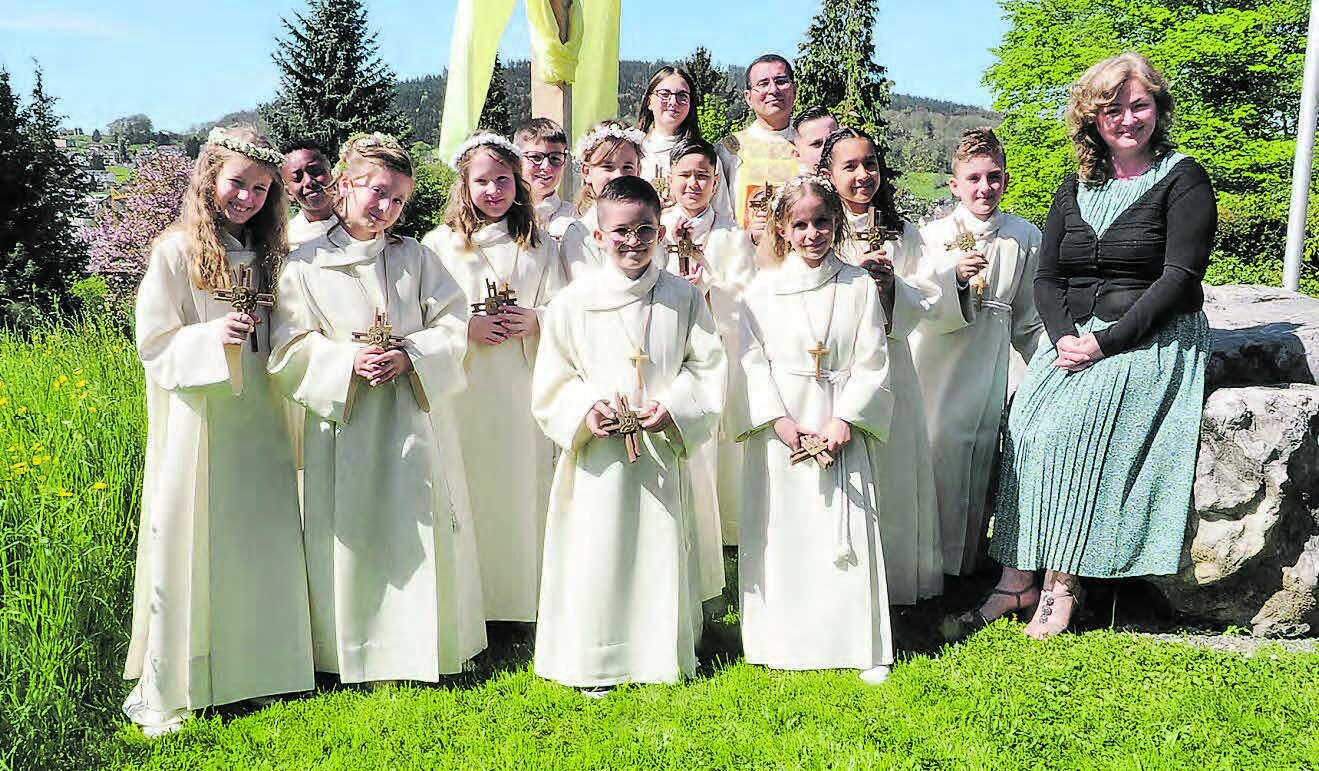 (Eing.) Am vergangenen Sonntag feierten 13 Kinder die Erstkommunion in der St.Annakirche Menziken. Zum Thema «Mit Jesus am Tisch» bereitete die Katechetin Gjyle Buzhala die Mädchen und Buben auf die erste heilige Kommunion vor. Das Pfarreiteam dankt allen Eltern, die in diesem Jahr die Kinder im Unterricht begleitet haben und auch all jenen, die bei den Vorbereitungen für das Fest mitgeholfen haben. Auf dem Bild zu erkennen sind neben den Kindern Pater Luis Reyes und Katechetin Gjyle Buzhala.