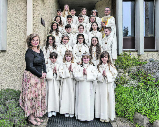 (Eing.) Am Weissen Sonntag, 7. April, feierten 22 Kinder die Erstkommunion in der St. Annakirche Menziken. Zum Thema «Mit Jesus am Tisch» bereitete die Katechetin Gjyle Buzhala die Mädchen und Buben auf die erste heilige Kommunion vor. Das Pfarreiteam dankt allen Eltern, die in diesem Jahr die Kinder im Unterricht begleitet haben und auch all jenen, die bei den Vorbereitungen für das Fest mitgeholfen haben. Auf dem Bild sind neben den Kindern Pater Luis Reyes und Katechetin Gjyle Buzhala zu erkennen. Am Sonntag, 14. April, um 10 Uhr in der Kirche Br. Klaus Unterkulm sowie um 10.15 Uhr in der Kirche St. Anna Menziken, finden nochmals Erstkommunionfeiern mit insgesamt 27 Kindern statt. (Bild: zVg.)