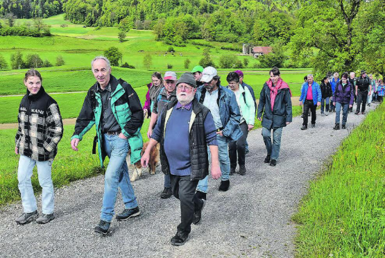 aw. Der Jodlerklub Echo Reitnau unternimmt einiges, um neue Mitglieder zu mobilisieren, die vierte Jodlerwanderung rund um Kirchleerau mit Stationen zum gemeinsamen Jodeln und Singen ist eine davon. Kürzlich brachen 121 Erwachsene inklusive jugendlichem Jodlernachwuchs zur zweistündigen Wanderung vom Treffpunkt bei Peter Bachmann auf. «D’Lüt im Dorf» und «Das cha nur Liebi si» erklangen unter der Leitung von Anna Eisenhut. Unterwegs stimmten Gäste «Hoch auf dem gelben Wagen» an. Es folgte aber nur das Haflingerfuhrwerk mit Kindern und weniger Marschtüchtigen. Zur Mittagszeit wartete Aargauer Braten auf die Teilnehmenden. Gastgeber Bachmann führte Interessierte durch seine Traktoren- und Baumaschinensammlung. Prunkstück im Privatmuseum ist die 100-jährige, fahrbare Konzertorgel. (Bild: aw.)