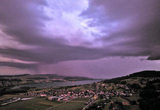 wal. Das Sommerwetter will einfach nicht kommen. Stattdessen fällt immer wieder Regen oder es ziehen sogar Gewitter über das Land. Am Abend des 7. Juni bildete sich eine kräftige Gewitterzelle, die das Seetal überquerte. Das Gewitter im Abendlicht verursachte eine gespenstische Stimmung über dem Hallwilersee. Auf dem Bild ist ein Schauer zu sehen, der über dem Lindenberg ausregnet und am Hallwilersee leuchtet das Licht der Sturmwarnung.