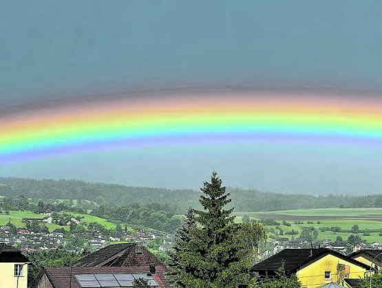 wal. Kürzlich zauberte das wechselhafte Wetter in Hallwil einen sehr kräftigen Regenbogen an den Himmel, der nur knapp über dem Horizont erschien. Ein Regenbogen entsteht durch die Lichtbrechung. Dabei wird das weisse Licht durch die Regentropfen, ähnlich wie in einem Glasprisma, in die Spektralfarben rot, grün, blau und violett zerlegt. In der Natur können wir ihn beobachten, wenn fallender Regen (oder auch ein Wasserfall) von der Sonne beschienen wird. Dabei haben wir die Sonne im Rücken und der Mittelpunkt des Regenbogens entspricht dem Gegenpunkt der Sonne. Man kann den Radius des Regenbogens nur mit Winkelgraden angeben, da der Regenbogen nur einen «scheinbaren Durchmesser» vom Betrachter aus hat. Der innere kräftigere Primärregenbogen weist einen Radius von 40-42 Grad auf und der…