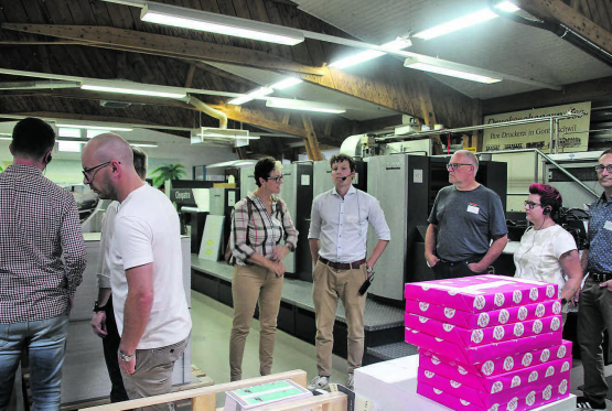 rms. Gut 20 Vertreterinnen und Vertreter der örtlichen kleinen und mittleren Unternehmen in Gontenschwil folgten Anfang September der Einladung zum jährlichen KMU-Treffen. Die Bedeutung dieses Anlasses wurde durch die Teilnahmen von Frau Gemeindeammann Renate Gautschy und Vizeammann Bruno Ellenberger zusätzlich unterstrichen. In diesem Jahr genoss die Gruppe Gastrecht bei Drucksachenexpress AG und Schüch-Verlag AG. Der Rundgang durch die beiden Betriebe, die sich die Räume teilen und Hand in Hand zusammenarbeiten, war beeindruckend. Sichtbar waren die Professionalität und die Vielfalt der angebotenen Produkte und Dienstleistungen, spürbar die Motivation der Mitarbeitenden. Das KMU-Treffen wurde durch einen feinen Apéro abgerundet.