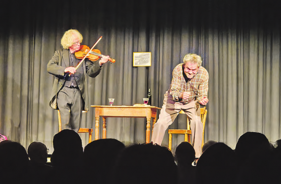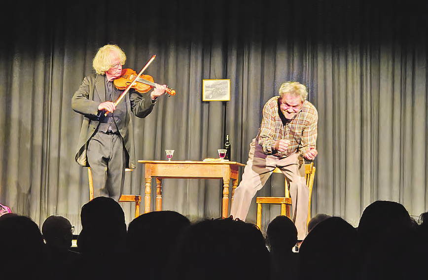 Wortlos trat Bisaz auf die Bühne, setzte sich hin und schenkte sich ein Glas Rotwein ein. Im Hintergrund untermalte Christian Hänni mit den hellen Klängen der Geige die Szene. In der Ruhe selbst blickte Bisaz mit einem breiten Schmunzeln ins Publikum, welches sichtlich amüsiert darüber war. Es war ungewiss, ob er diesen Moment nochmal besonders genoss oder ob er bereits in seinem Element als Schauspieler war. Es weckte die Neugier im Publikum. Was geschieht nun?