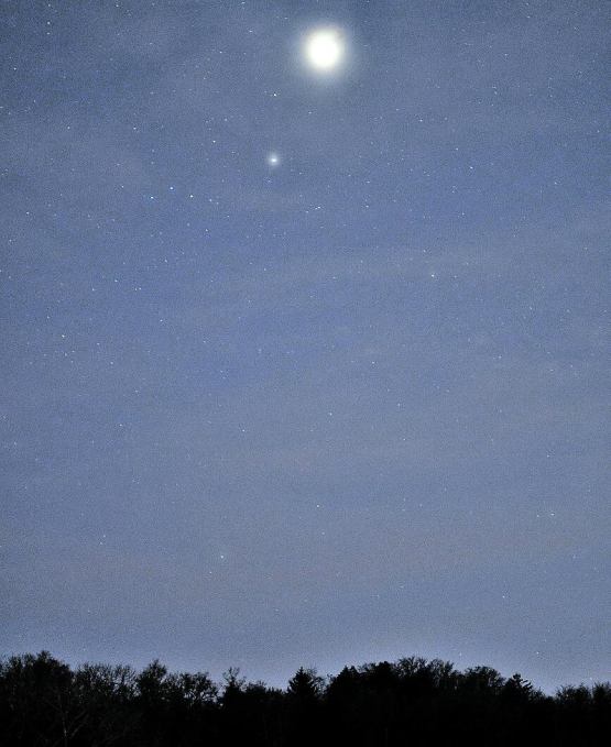 Zurzeit wird der Abendhimmel von den beiden Planeten Venus und Saturn dominiert, die auffällig im Südwesten leuchten. Die beiden Planeten, die ungewöhnlich nahe sind, waren am Abend des 20. Januar durch eine dünne Wolkenschicht gut zu sehen. Der obere sehr helle Planet ist die Venus, der untere, weniger helle Planet, ist Saturn. Das Bild wurde in Hallwil aufgenommen.