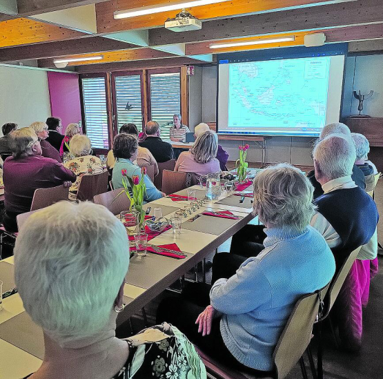 (Eing.) Indonesien ist ein riesiges und vielfältiges Land! Pfarrerin Ruth Schäfer erzählte Mitte Februar dreimal an den 60Plus Nachmittagen der reformierten Kirchgemeinde Kulm in den Gemeinden Unterkulm, Oberkulm und Teufenthal von ihrer Zeit als Dozentin an einer Theologischen Hochschule. Sie weilte in Südkalimantan (Borneo) von Anfang 2005 bis Mitte 2011. Lebendig erzählte sie von ihrem langjährigen Aufenthalt: Von der Geschichte des Landes, der politischen Situation, der Sprache, der Natur und dem kirchlichen Leben. Indigene Pfarrerinnen und Pfarrer gut auszubilden, ist ein Herzensanliegen von Ruth Schäfer und sie verstand es, die Zuhörerinnen und Zuhörer mit ihrem Vortrag zu begeistern. Im Anschluss offerierten die freiwilligen Helferinnen und Helfer den Anwesenden ein feines Zvieri.…