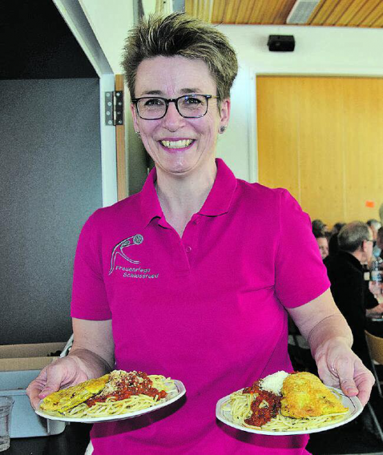 st. Die Frauenriege Schlossrued lud auch dieses Jahr zum gemütlichen Spaghettiund Risottoplausch in die Turnhalle ein. Bei wunderbarem Frühlingswetter liess sich dieser Anlass mit einem erholsamen Spaziergang verbinden. Aber den parkierten Autos nach zu urteilen, sind die südländischen Spezialitäten, die hier in grossen Portionen im Angebot stehen, in der ganzen Region bekannt. Und wie unser Bild beweist: Dazu serviert werden auf sehr sympathische Art erntefrischer Salat und Piccata. Zudem lässt das Dessertbuffet keine Wünsche offen. Die kleinen Gäste werden zu einem «Ausflug auf die Geschichteninsel» eingeladen.