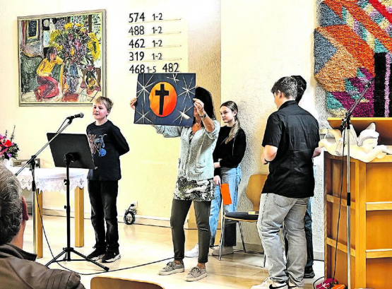 (Eing.) Das Thema am feierlichen Familiengottesdienst in der Aula in Oberkulm vom Ostersonntag mit Pfarrer Sandor Jakab war das Wunder der Auferstehung Jesu Christi, welche die Überwindung des Todes und die Zusage eines neuen, ewigen Lebens symbolisiert und den Menschen Hoffnung und Zuversicht gibt. Die von Katechetin Jeanette Gut und den Jugendlichen mit Spraydosen vorbereiteten, sehr schönen Bilder erfreuten alle. Gemeinsam wurde das Abendmahl eingenommen. Danach suchten die Kinder Ostereier und Schoggihäsli und im Anschluss an den Gottesdienst erfreuten sich die Anwesenden an einem feinen Aperitif. (Bild: zVg.)