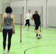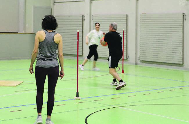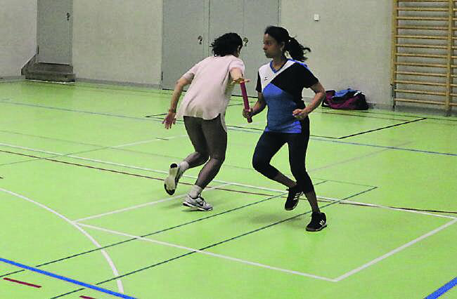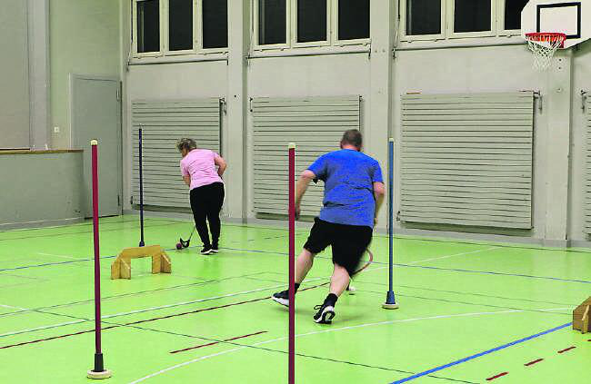 Wir beginnen mit dem Aufwärmen und verteilen dafür Matten in der Halle. Pamela erklärt uns, dass wir durch die Halle joggen und immer, wenn wir auf eine Matte treffen, darüber hüpfen oder im schnellen Wechselschritt die Matte überqueren sollen. Alles gut so weit. Nach circa 10 Minuten löst die Trainerin die Einheit auf und ich spüre bereits das erste Mal meinen erhöhten Puls im Hals. «Nun, soll ja so sein, wenn trainiert wird», denke ich mir. Nach einer kurzen Verschnaufpause geht es in kurzen Spieleinheiten für Körper und Koordination weiter. Obwohl ich das erste Mal in der Gruppe bin und sich viele bereits mehrere Jahre kennen, fühle ich mich wider meine Erwartungen nicht als die Neue oder die Fremde von der Zeitung. Im Gegenteil, meine anfängliche Nervosität ist verflogen und ich lasse mich bespassen beim Zuhören, wie sich die Männer gegenseitig auf die Schippe nehmen. Nebenbei werden Erinnerungen wach, wenn ich das Geräusch quietschender Turnschuhe höre und den altbekannten Mattenwagen erblicke, welchen wir in der Schulzeit öfters zweckentfremdeten, um uns in der Turnhalle mit der rollenden «Burg» zu duellieren.