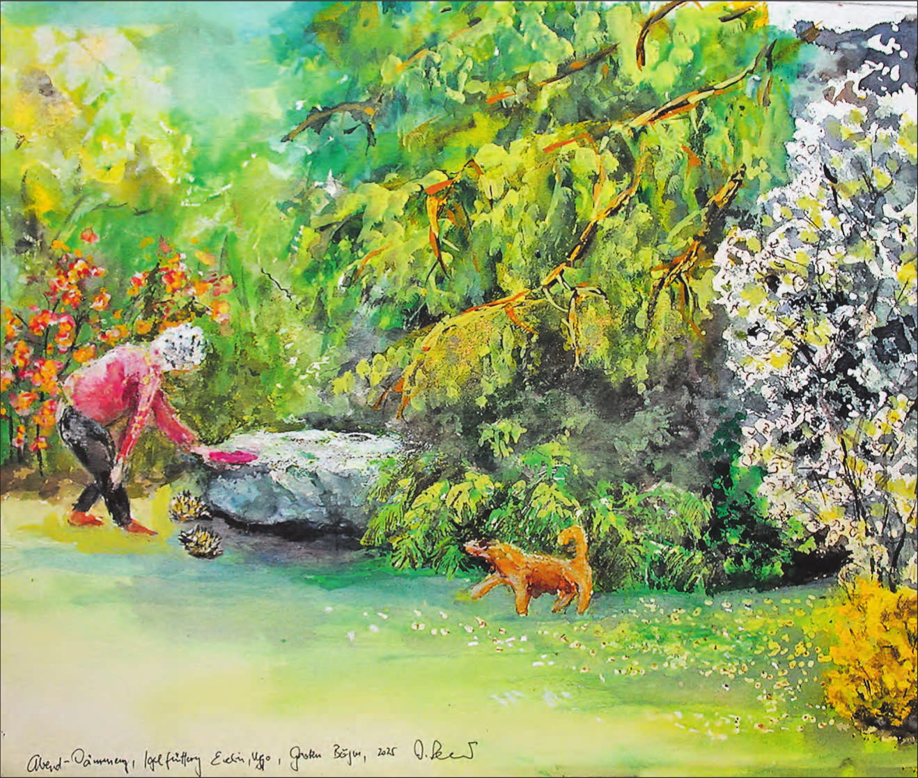 ro. Meistens erst in der Dämmerung vom Tag, oft auch später, aber jedenfalls dem Abend zu, erhalten unsere im Garten wild lebenden Igel eine Fütterung durch meine Frau Evelin, dies hinten beim Findling mit seiner immer trockenen Unterseite. Unser Hundeli Uggo war zu seiner Lebenszeit dann meistens nicht dabei, obschon er gerne beteiligt gewesen wäre. Es ist Frühling und auch in der Dämmerung leuchten all die Rosen und anderen Blumen im Garten Böju. Manchmal in der Frühlingzeit singen die Vögel – vor allem die Amseln – noch eines ihrer Lieder zum ausklingenden Tag. Das alles hat viel mit Frieden und Ruhe zu tun und die Stimmung ist dadurch versöhnlich, jedenfalls Frieden pur …