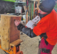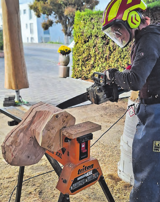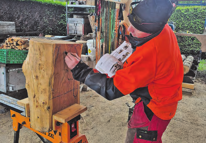 Auf einem Holzstamm hat Erismann bereits alle nötigen Utensilien wie eine schnittfeste Überhose, Handschuhe, Schutzbrille und Gehörschutz vorbereitet. Aufmerksam höre ich ihm zu, als er mir die Vorsichtsmassnahmen erklärt. Für das Schnitzen benutzen wir eine sogenannte Carving-Motorsäge. Diese sind vorne am Sägeblatt spitzer. Dadurch minimiert sich der gefährliche Rückschlag.