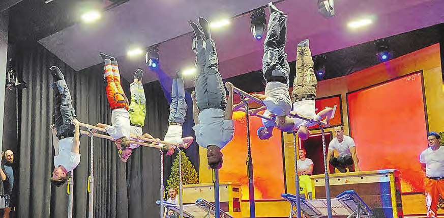 Der zweite Teil des Programms war dann geprägt von eben diesen Sparmassnahmen, was dem unterhaltsamen Spektakel aber nichts anhaben konnte. So wurde der Strom nun hinter den Kulissen mittels Ergometer erzeugt. Sogar an der Ausstattung des Moderationsteams wurde nun sichtbar gespart. Anstelle der Fussball-WM der Männer wurde die Frauenfussball-EM übertragen, was emotional aber mindestens ebenbürtig war. Die Nummer «Hopp Schwiiz» war eine von vielen, von denen das Publikum eine Zugabe forderte. Einen wahren Begeisterungssturm lösten die Akteurinnen und Akteure auf der Bühne mit der Nummer «Fake News» aus. 24 schwarz und weiss gekleidete Menschen sassen in Reihen auf sechs Treppenstufen und zeigten eine unglaubliche Choreografie. Man kann nur erahnen, wie aufwändig das Einstudieren dieser Nummer war. Allein für dieses Highlight lohnte sich der Besuch des Satus-Turnerabends!