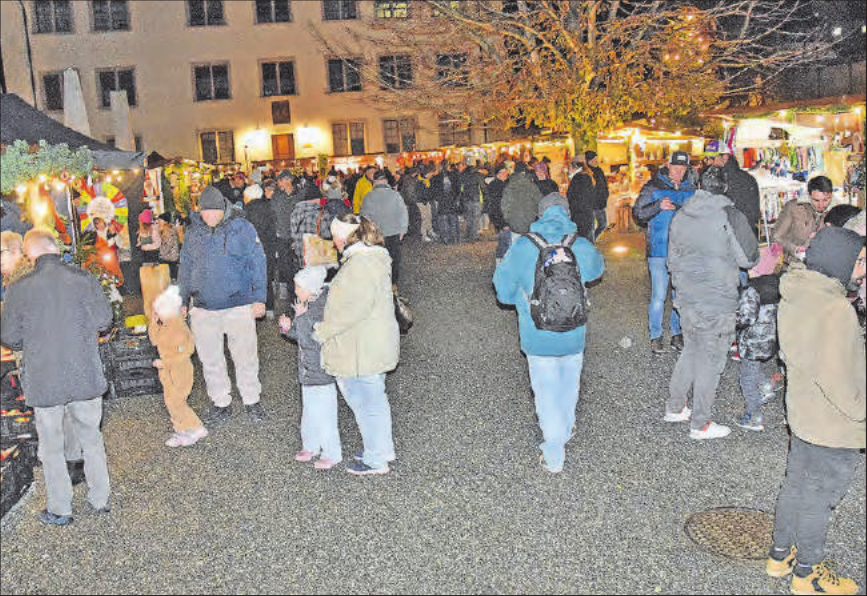Eine heimelige Atmosphäre bot der Markt mit rund 50 Buden nach Hereinbrechen der Dämmerung. Bunte Lichter überall verbreiteten eine weihnachtliche Stimmung im historischen Schlosshof. Nicht nur Erwachsene, auch Kinder lauschten den Alphörnern oder wärmten am offenen Feuer ihre Hände, das die Suppe im darüber hängenden Kessel warmhielt. Nicht nur der feine Suppengeruch lockte die Marktbesucher an, ein Raclette-Brot aus den Händen des Kommandanten der Regiowehr Suhrental David Rickenbach oder seinem Chauffeur Simon Lüscher gehörte zu den Geheimtipps gegen das Hungergefühl. Verpflegung gleich am Eingang zum Schlossgarten bot der Schöftler Club10, mit dabei: Gemeindeammann Thomas…