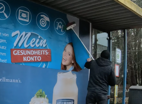 «Komisch», denke ich. «Die machen das ja immer noch wie eh und je.» Ich frage mich, ob es dafür nicht modernere Methoden gäbe. Spontan fallen mir selbstklebende Motive ein, und vor meinem geistigen Auge erscheinen beispielsweise die bunten Pril-Blumen, wie sie in den 1970er und 80er-Jahren in fast jeder Schweizer Küche auf Wandplättli klebten. Von denen gabs jeweils zwei oder drei Stück auf einer Spülmittelflasche. «Wieso sollte man nun Plakate auf Spülmittelflaschen kleben?» meldet sich mein Gedankenkarussell. Ich schmunzle. Was gibt es noch? Gummierte Klebeflächen, die nur angefeuchtet werden müssen. Als ehemaliger Pöstler mit jahrelanger Schaltererfahrung kenne ich die natürlich noch von damals, als Briefmarken noch gummiert waren und ins gelbe, nasse Schwämmli gedrückt wurden, bevor man sie verkleben konnte. Es gab auch Couverts mit gummierter Lasche. Als Kind habe ich diese natürlich gerne mit meiner eigenen Zunge abgeleckt. Auch Briefmarken, die schmeckten sogar noch besser. Ich stelle mir grad vor, wie das aussehen würde, wenn der Plakatmann die ganze Fläche mit seiner Zunge ...