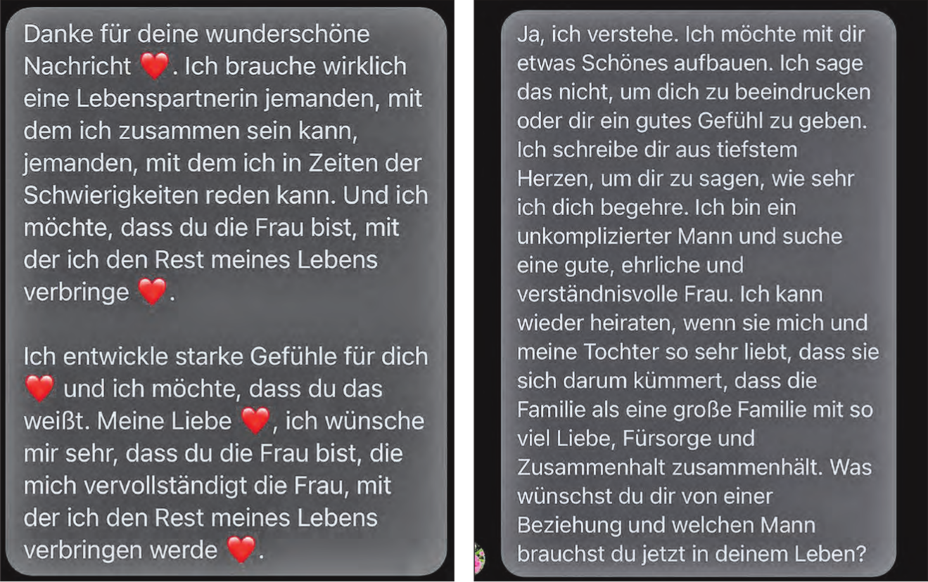 Um genau zu verstehen, wie man in die Klauen der Romance Scammer rutschen kann, habe ich mich bewusst auf Scam-Chats eingelassen und versucht, die Muster darin zu erkennen. Über Wochen hinweg beobachtete ich das Geschehen oder nahm aktiv als fingiertes Opfer daran teil. Fazit: Als bewusste Beobachterin erkannte ich die Grenzen zwischen Realität und Vorspiegelung falscher Tatsachen. Doch auch mir kamen zwischendurch Zweifel, ob das wirklich nur gespielt ist oder sich doch ein Mensch aus Fleisch und Blut dahinter versteckt. Als richtiges Opfer hätte man bereits verloren, wenn man das geschriebene Wort ins Herz lässt.