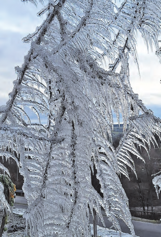 Die beiden Bilder dieses reichlich mit Reif behangenen Frostbaumes sandte uns Gaby Blättler. Sie entstanden am 2. Januar kurz nach Mittag auf der Burg. Das Zusammenspiel von eisiger Kälte, genügender Luftfeuchtigkeit und etwas Wind ist nötig, um dieses wunderbare Naturphänomen spriessen zu lassen. Dank ihrem aufmerksamen Auge ist es uns möglich, dieses zerbrechliche Kunstwerk auch mit unserer Leserschaft zu teilen. Ein schönes Geschenk zum Start ins neue Jahr. Merci!