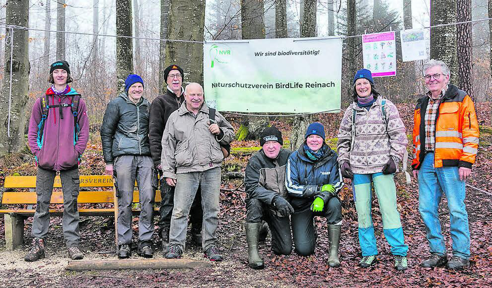 Neophyten ausreissen im Winter? Da gibt es doch gar keine. Doch, sie sind da, die immergrünen Schadpflanzen wie Kirschlorbeer, Cotoneaster und Henrys Geissblatt. Diese sieht man jetzt besonders gut ohne Vegetation, weshalb der Naturschutzverein BirdLife Reinach diesen im Sonnenbergwald eine Wurzelbehandlung verpasste.