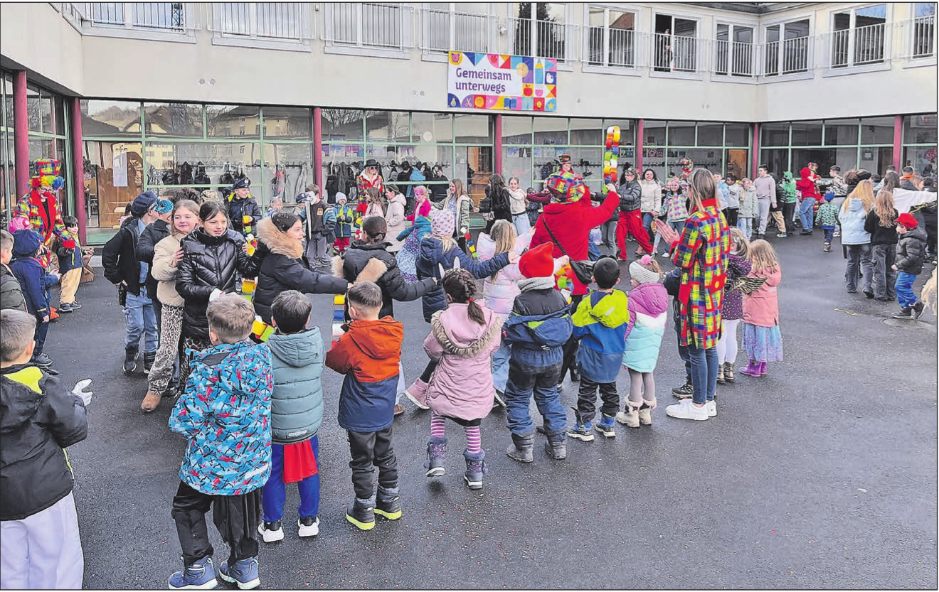 Bunter Konfettiregen, lachende Kinder und fröhliche Musik – passend zum Motto «Gemeinsam unterwegs» wurden die Kindergartenkinder anlässlich des Fasnachtsumzugs im Primarschulhaus empfangen. Die Primarschülerinnen und Primarschüler standen Spalier, klatschten und jubelten, während die Kleinsten bunt verkleidet stolz durch die Reihen liefen.