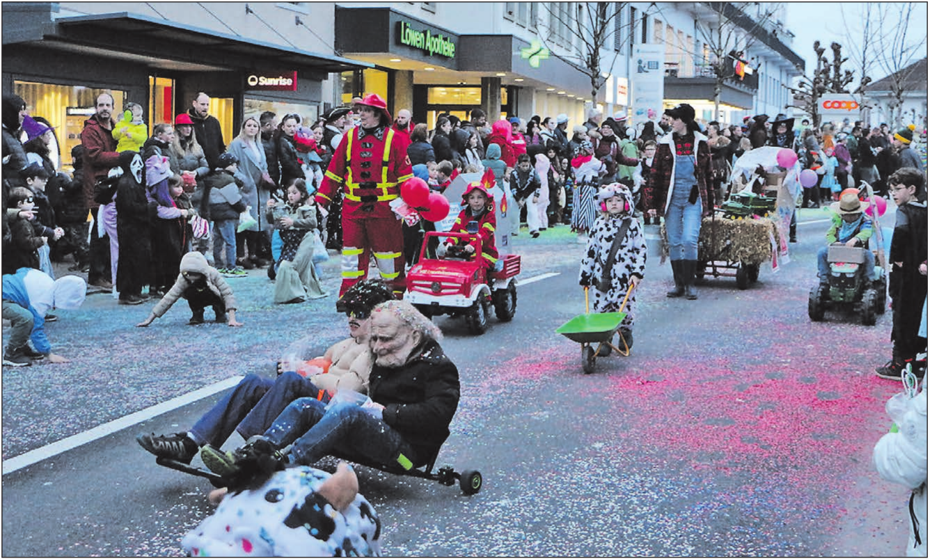 Wer am späteren Freitagnachmittag seinen Einkauf in Reinach erledigen wollte, begegnete lange vor Umzugsstart quirligen und bunt verkleideten Menschen. Die Kinder waren meist mit einem Sack Konfetti ausgerüstet und dem einen oder anderen juckte es bereits in den Fingern, die Flugfähigkeit der Papierschnitzel auszutesten. So dauerte es nicht lange und die braunen Pflastersteine vor dem Bärenmarkt waren mit den kunterbunten Konfettis verschönert.