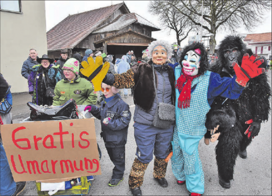 Einmal im Jahr verdrei- bis verfünffacht sich die Einwohnerzahl Schlierbachs, immer dann, wenn der Fasnachtsumzug durch das Dorf zieht. Auch dieses Jahr drängten sich Menschen dicht an dicht am Strassenrand von der Käserei Etzelwil bis zum Gemeindehaus. Bis der von der heimischen Roggenzunft organisierte Umzug startete, konnten sich die vielen Schaulustigen, die teilweise sogar mit Cars anreisten, in vielen «Fasnachtsbeizli» mit so glorreichen Namen wie «Rammler-Stöbli» oder an kleinen mobilen Getränkeständen verpflegen lassen – inklusive einer gratis Umarmung, wenn…