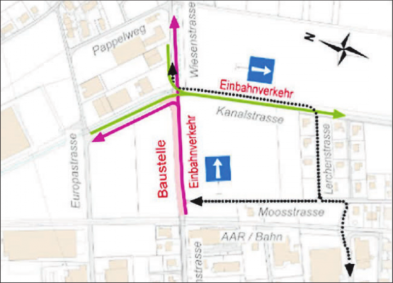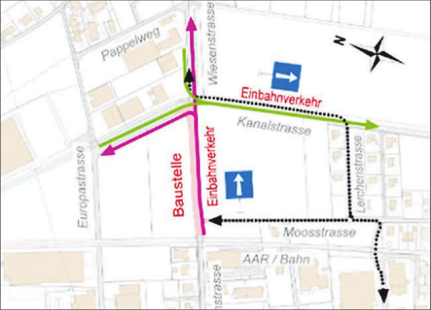 (Mitg.) Die Bauarbeiten zur Sanierung der Wiesenstrasse mit dem Neubau eines Gehwegs beginnen am 9. März 2026. Die Bauzeit wird sich voraussichtlich über einen Zeitraum von rund vier Monaten erstrecken, währenddessen der Verkehr teilweise eingeschränkt oder umgeleitet wird. Für Fussgänger und Fussgängerinnen wird eine Umleitung über die Kanal-, Lerchen- und Moosstrasse eingerichtet. Die entsprechenden Signalisationen werden vor Baubeginn installiert.