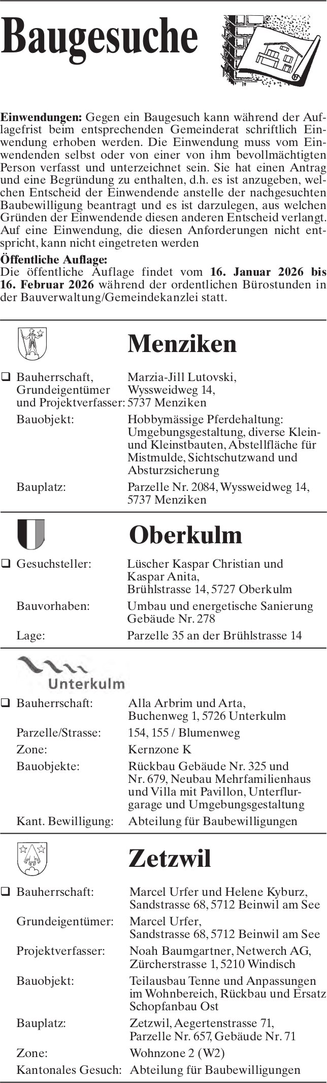 Baugesuche, Menziken - Gemeinde Menziken, Baugesuche