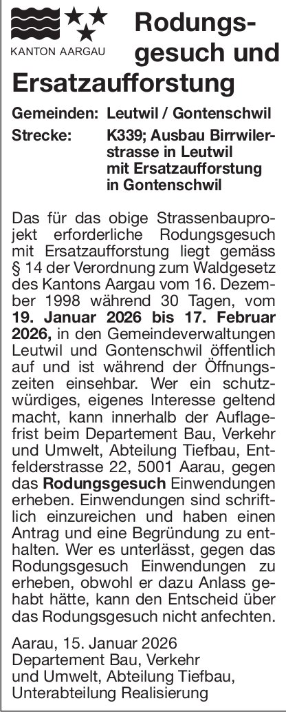 Baugesuche, Aarau - Departement Bau, Verkehr und Umwelt, Rodungsgesuch und Ersatzaufforstung