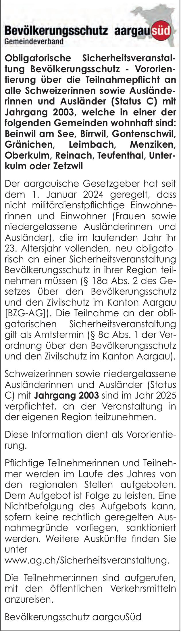 Sonstiges, Bevölkerungsschutz aargau Süd, Obligatorische Sicherheitsveranstaltung Bevölkerungschutz - Vororientierung