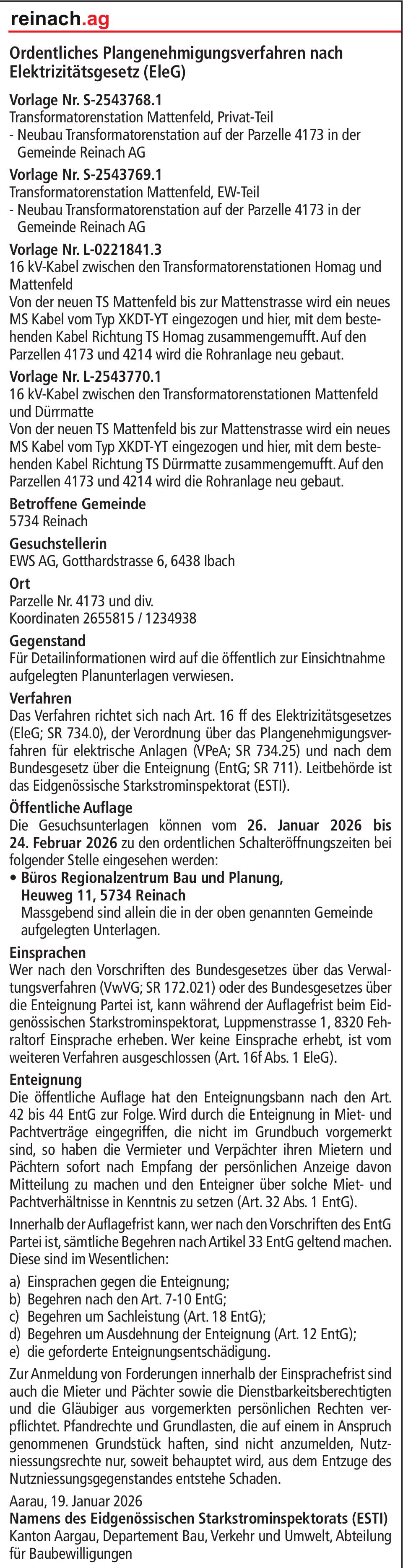 Baugesuche, Ibach - EWS AG, Ordentliches Plangenehmigungsverfahren nach Elektrizitätsgesetz (EleG)