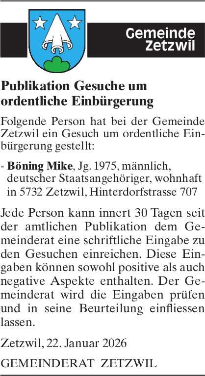 Sonstiges, Zetzwil - Gemeinde Zetzwil, Publikation Gesuche um ordentliche Einbürgerung
