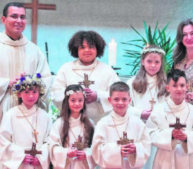 (Eing.) Am Weissen Sonntag, am 16. April, feierten in Beinwil am See (linkes Bild) und Menziken insgesamt 16 Kinder die Erstkommunion. Zum Thema «Jesus du bist mein Lebensbaum» bereiteten die Katechetinnen Gjyle Buzhala, Dulce Maria Galarza und Rahel Müller die Mädchen und Buben auf die erste…