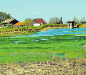 msu. Viel zu warm, viel zu trocken und viel zu wenig «Nahrung», sprich Regen: Der Burger Weiher droht zu verlanden und präsentiert sich in diesen Frühlingstagen, die beinahe als Sommertage bezeichnet werden können, schon bald zur Hälfte als grüner Algenteppich. (Bild: msu.)