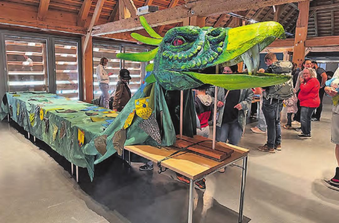 Konzentriert sitzen die Kinder an einem grossen Tisch, ausgebreitet vor ihnen liegen Tonpapier, Buntstifte und Sticker. Daraus sollen Schuppen für den grossen Drachen, der im Raum aufgebaut ist, gebastelt werden. Monika Werren, Museumsfreiwillige, sagt schmunzelnd: «Besonders beliebt sind natürlich die Buntstifte und Sticker mit Glitzer.» Aber so etwas passt natürlich auch am besten zu einem Drachen. Wenn die Schuppe fertig ist, stellt sich nur noch die Frage, wo sie an dem Fabeltier befestigt werden könnte – zum Glück sind dabei die Eltern immer behilflich.