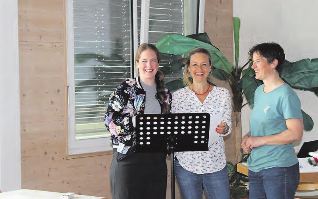Der Seminarraum war ein einziges Willkommen. Die Kursunterlagen lagen auf den Tischen bereit. Getränke und schokoladige «Nervennahrung» hatten ihren Platz. Die Sonne strahlte mit den Dozentinnen Stephanie Reimann, Mirjam Haldimann und Sabrina Landgraf um die Wette. Unter den Angemeldeten befanden sich nicht nur angehende Eltern. Bei manchen war der Nachwuchs schon vor Ort. Was gänzlich unproblematisch war. Denn helfende Hände organisierten flink von Kissen bis Bilderbüchern, alles Nützliche.