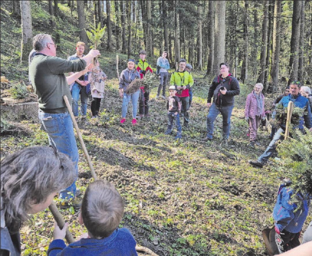 Insgesamt wurden auf dem Pflanzgebiet im Ischlag 200 Weisstannen gesetzt. Ergänzend pflanzten die Teilnehmenden 28 Bergahorne, die jeweils mit Einzelschützen versehen wurden. Diese Schutzmassnahmen sollen verhindern, dass junge Triebe von Wildtieren beschädigt werden. Die ausgewählten Baumarten sind gut an die Bedingungen des Standortes angepasst. Mit Spaten und Schaufeln ausgerüstet machten sich die Familien ans Werk. Während Erwachsene die Pflanzlöcher vorbereiteten und die jungen Bäume sorgfältig einsetzten, halfen die Kinder eifrig mit, die Erde rund um die Setzlinge festzutreten. Schritt für Schritt entstand so ein neues Stück Wald.