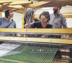 • Gränichen rms. Im 3. Obergeschoss des landwirtschaftlichen Zentrums Liebegg stehen sieben fixfertig eingerichtete Webstühle, die es zu bewegen gilt. Das tut seit April dieses Jahres Johanna Eschmann (Bildmitte) mit ihren Webkursen. Sie lud am Samstag vergangener Woche zum Kurs «Handweben…