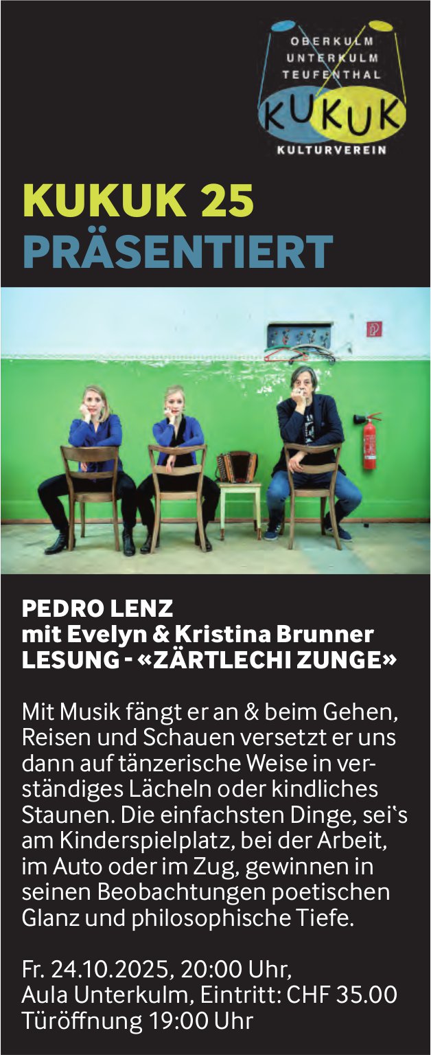 Pedro Lenz mit Evelyn & Kristina Brunner Lesung - «Zärtlechi Zunge», 24. Oktober, Aula Unterkulm