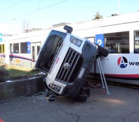 Eine Automobilistin überquerte am Mittwoch mit einem Kleinbus einen Bahnübergang, obwohl sich eine Zugkomposition der WSB näherte. Bei der heftigen Kollision wurde das Auto zwischen dem Zug und einer - zum Glück nur niedrigen - Mauer eingeklemmt. Die beiden Insassen im Auto leicht verletzt. Die Bahnstrecke blieb unterbrochen.
