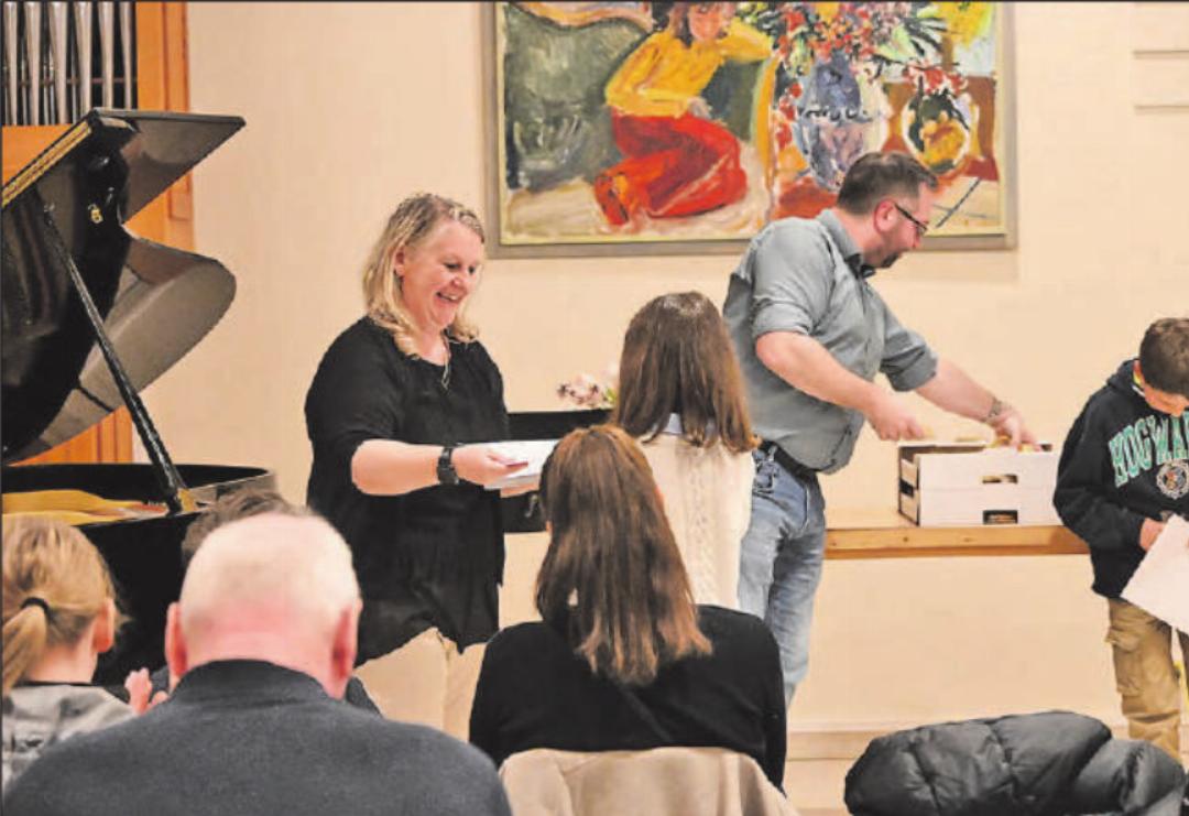 (Eing.) Im Rahmen der mCheck-Feier durften Eva Freiburghaus, Musikschulleiterin, und Alexander Allmann, Co-Präsident des Musikschulrats, die entsprechenden Zertifikate zusammen mit einem kleinen Präsent überreichen.Am diesjährigen mCheck waren verschiedene Instrumente vertreten, darunter Schlagzeug, Keyboard, Gitarre, Sologesang, Blockflöte, Violine, Cello, Akkordeon und Klavier.