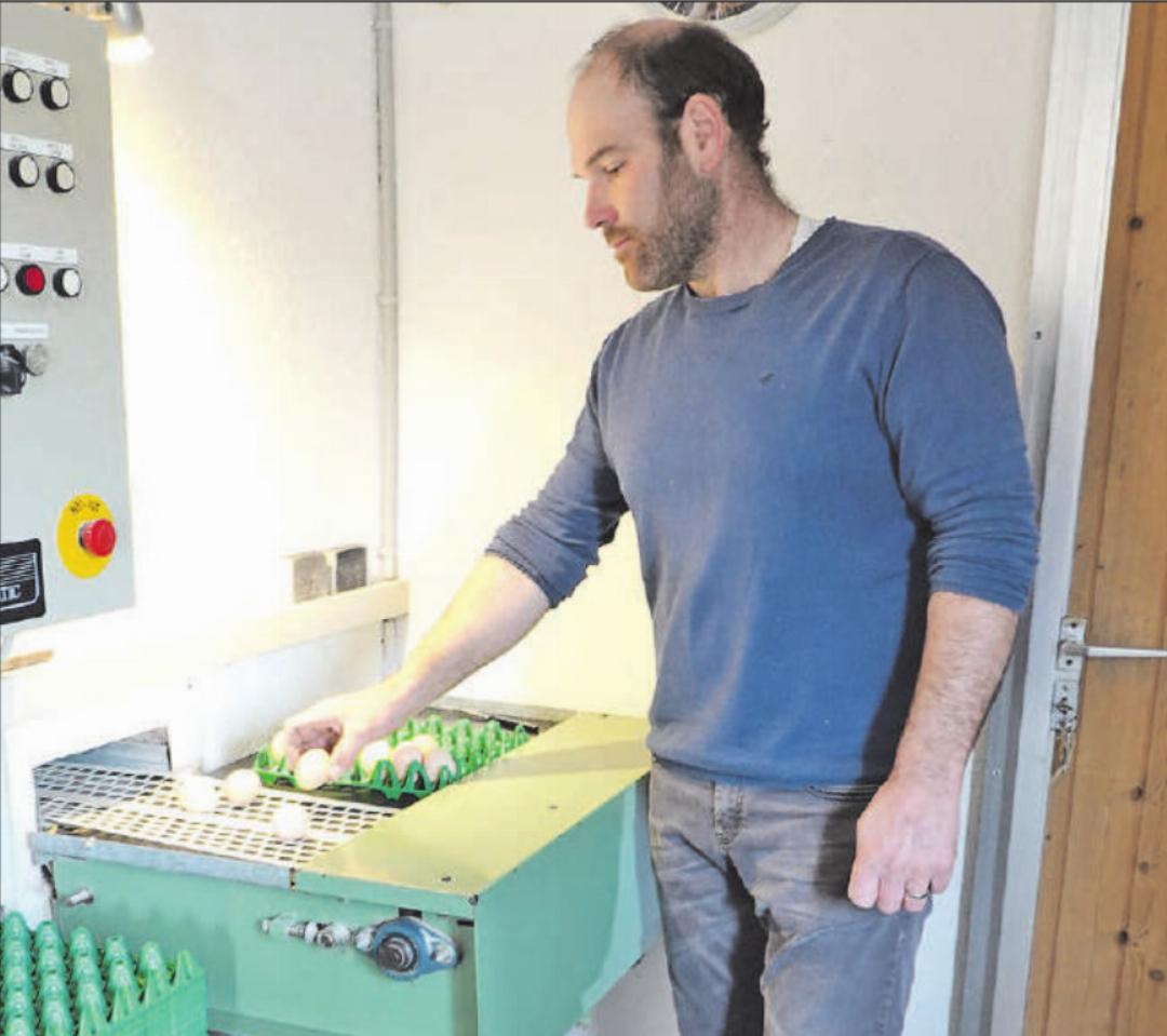 Ostereier sind sehr gefragt. Pro Woche werden 12’600 Eier von der Ei AG, einem Abpackbetrieb für Schweizer Eier in Sursee, abgeholt. Vorher ist auch viel Handarbeit gefragt. Es gilt, die auf dem Laufband eingesammelten Eier zu sortieren, falls nötig zu reinigen und mit einer Maschine zu datieren. Um die 400 Eier werden pro Woche direkt im eigenen Hofladen in Oberkulm verkauft.