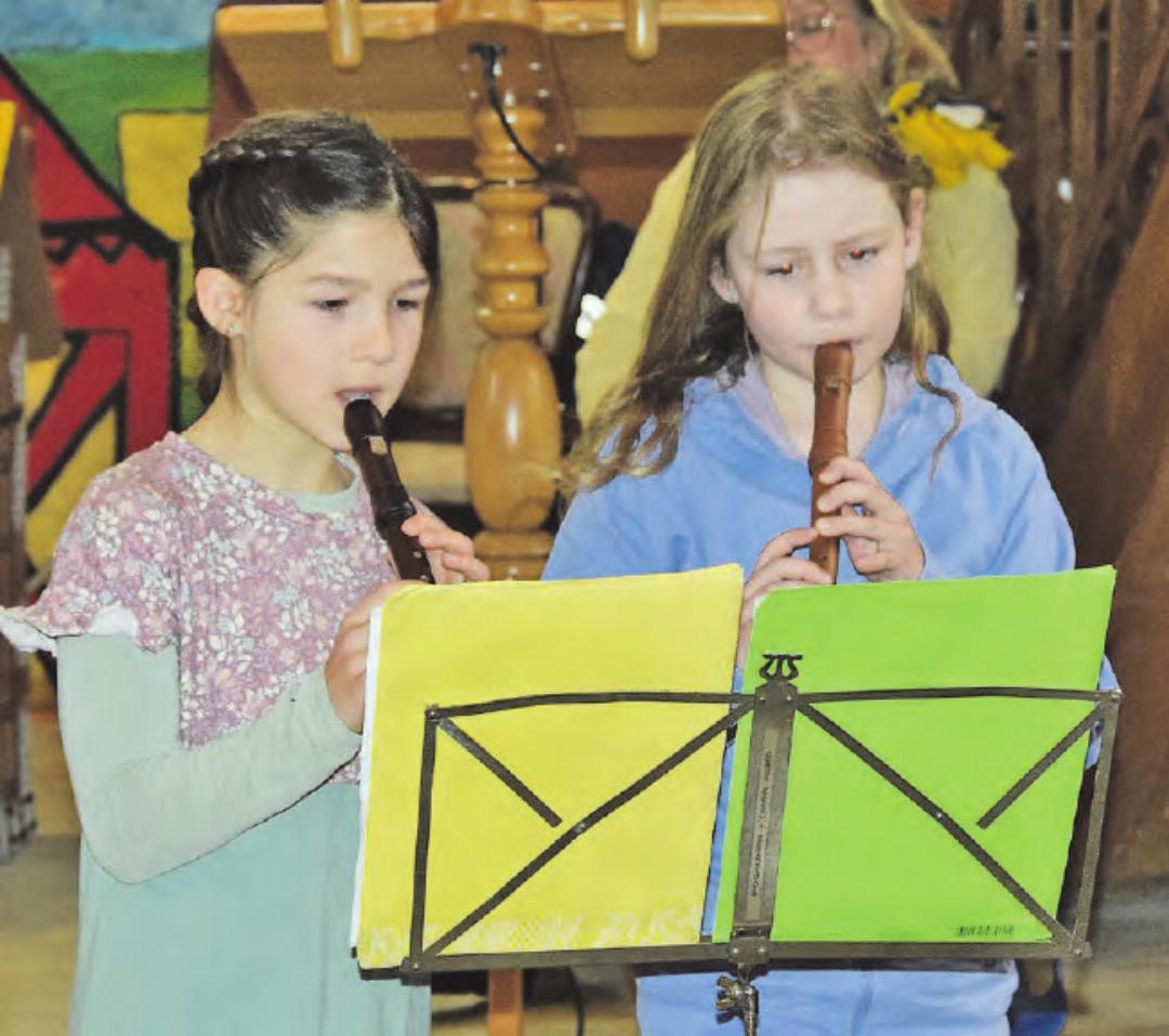 Zwei Flötenspielerinnen ersetzten das Orgelspiel am Sonntagmorgen in der Kirche Rued. Es sein kein gewöhnlicher Gottesdienst an diesem Weissen Sonntag, meinte Pfarrerin Nadine Hassler Bütschi, denn die Kinderwochenkinder waren die Hauptakteure, unterstützt durch Bilder auf der grossen Leinwand.