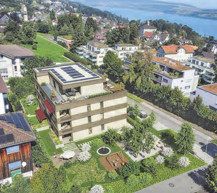 Die Architektur überzeugt durch den Einsatz natürlicher Materialien wie Holz und offene Strukturen. Grosszügige Fensterfronten und klare Linien schaffen lichtdurchflutete Räume mit viel Wohnkomfort und Sicht auf die umliegende Natur. Zudem erfüllt das Gebäude den Minergie-P-Standard: eine hochmoderne Grundtechnik mit Wärmepumpe (Erdsonden), Komfortlüftung mit Freecooling und Photovoltaikanlage kombiniert für energieeffizientes Wohnen.